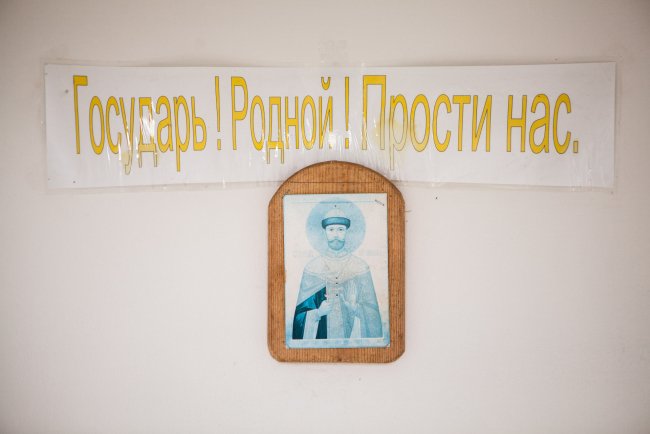 При въезде в Дудачкино на воротах Архангельского братства — потускневший образ Николая II c покаянным воплем // Фото: Елена Лукьянова