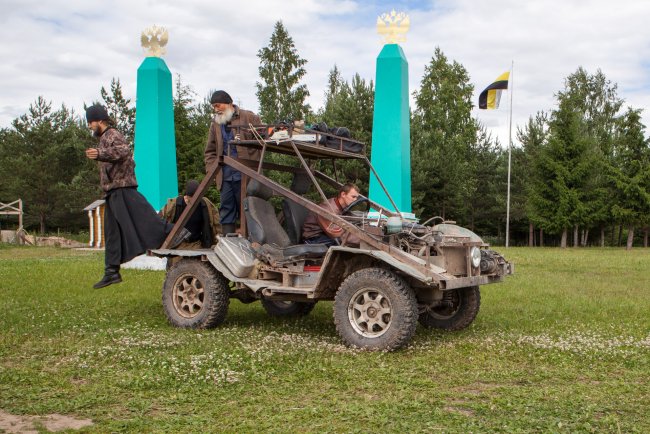 Молодой бородач в казачьей кубанке представился трудником Алексеем, от расспросов отмахнулся, схохмил, что сюда его привела любовь к природе, и убежал. После этого на чем-то вроде багги из «Нивы» примчался десант бравых мужчин в спецовках и подрясниках. Один из них, инок, направил нас к «главному».