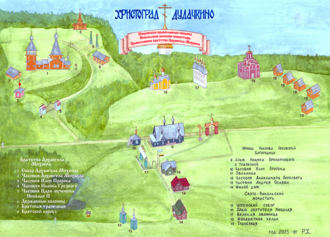 Дудачкино – глухая деревня меньше чем в полусотню домов в двух часах езды от Петербурга. Когда-то тут был богатый совхоз «Победа Октября». Обочины вдоль дороги заросли борщевиком, однако кому надо найдет и упрется в указатель: Христоград. Обычная деревня трансформировалась в религиозное поселение, на территории которого находятся мужские и женские обители: Никольская женская община, Архангельское братство и Покровская община.