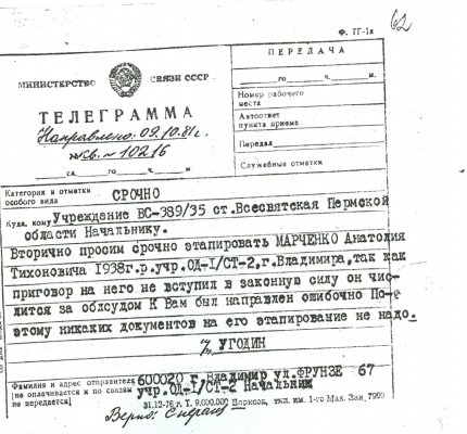 Мы публикуем письмо начальника Владимирской тюрьмы Александра Угодина начальнику пермского лагеря № 35 Николаю Осину с просьбой срочно вернуть Марченко. Документ сохранился в тюремном деле Анатолия Марченко, копия которого находится в архиве Международного Мемориала (ф.117).