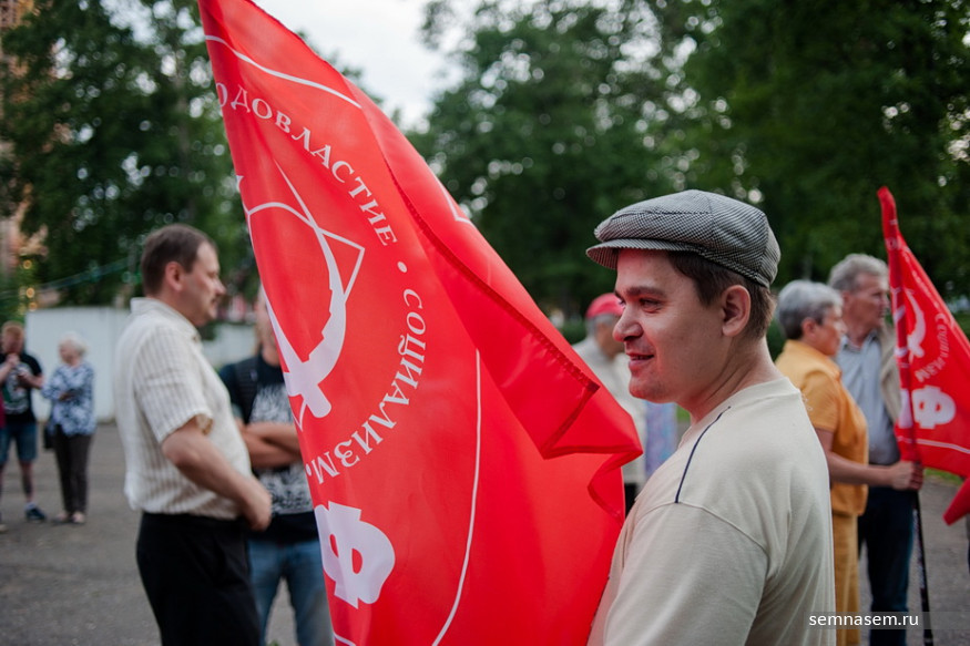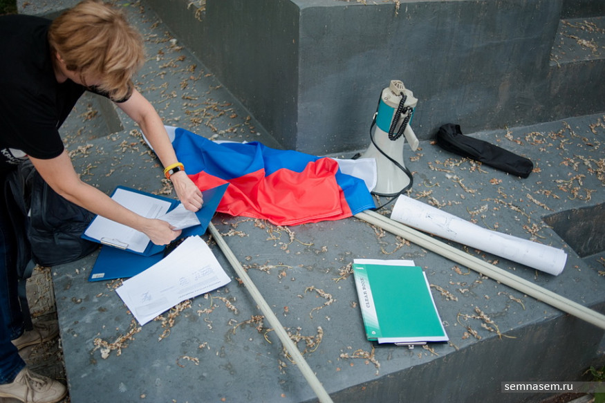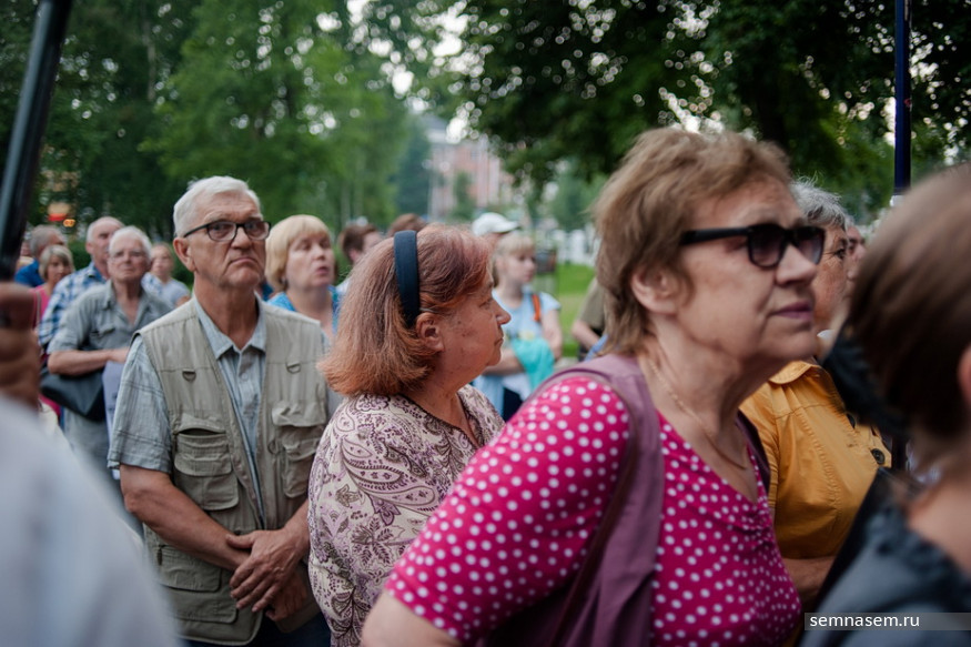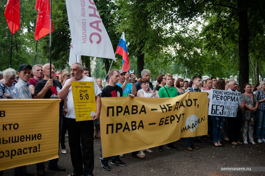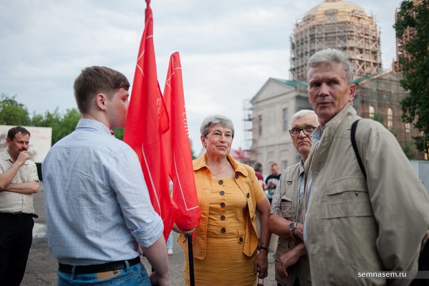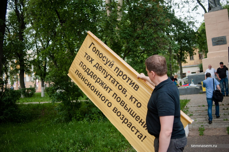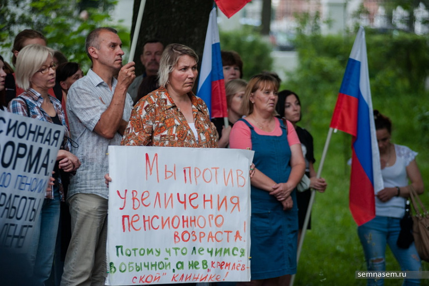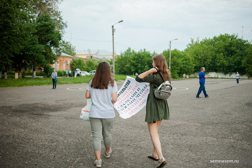 Протест против пенсионной реформы объединил людей с флагами КПРФ, ПАРНАСа, движения «Солидарность» и российским триколором. Пришли подростки, пенсионеры, несколько женщин с маленькими детьми. Возраст большинства участников — от 35 до 50 лет. Первыми развернули плакат 15-летняя Марина и 16-летняя Полина.