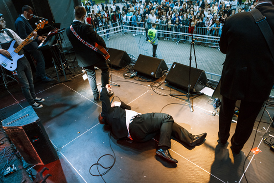 Как и на любом крупном фестивале, чтобы услышать любимого исполнителя, здесь лучше занимать места заранее. Концерт Эмира Кустурицы и его The No Smoking Orchestra на площадке у Главпочтамта собирает 15 000 человек, ради которых перекрывают проезжую часть. Сам режиссер, напоминающий то ли гусара, то ли казацкого атамана, много общается с аудиторией и чуть ли не каждую песню заканчивает темой из «Розовой пантеры» — к чему бы это? Внушительное количество людей собирается и вокруг сцены «Плотинка», где выступает автор суперхита «Розовое вино» Feduk, — сам концерт на фоне столь массового ажиотажа выглядит довольно блекло. Космополитичные Therr Maitz в очередной раз оправдывают статус одной из самых профессиональных инди-групп страны — и пусть их выступление не дарит никаких сюрпризов, но словно бы держит аудиторию в большом кулаке. Праздник традиционно завершается хоровым исполнением песни «Луч солнца золотого» из мультфильма «Бременские музыканты»: под звуки камерного оркестра B-A-C-H над столицей Урала восходит солнце — удивительный момент, который становится наградой для самых стойких.