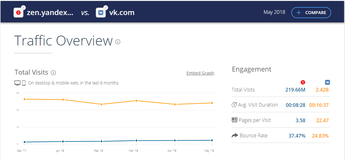 Сравнение аудитории сайтов zen.yandex.ru и vk.com. Данные SimilarWeb