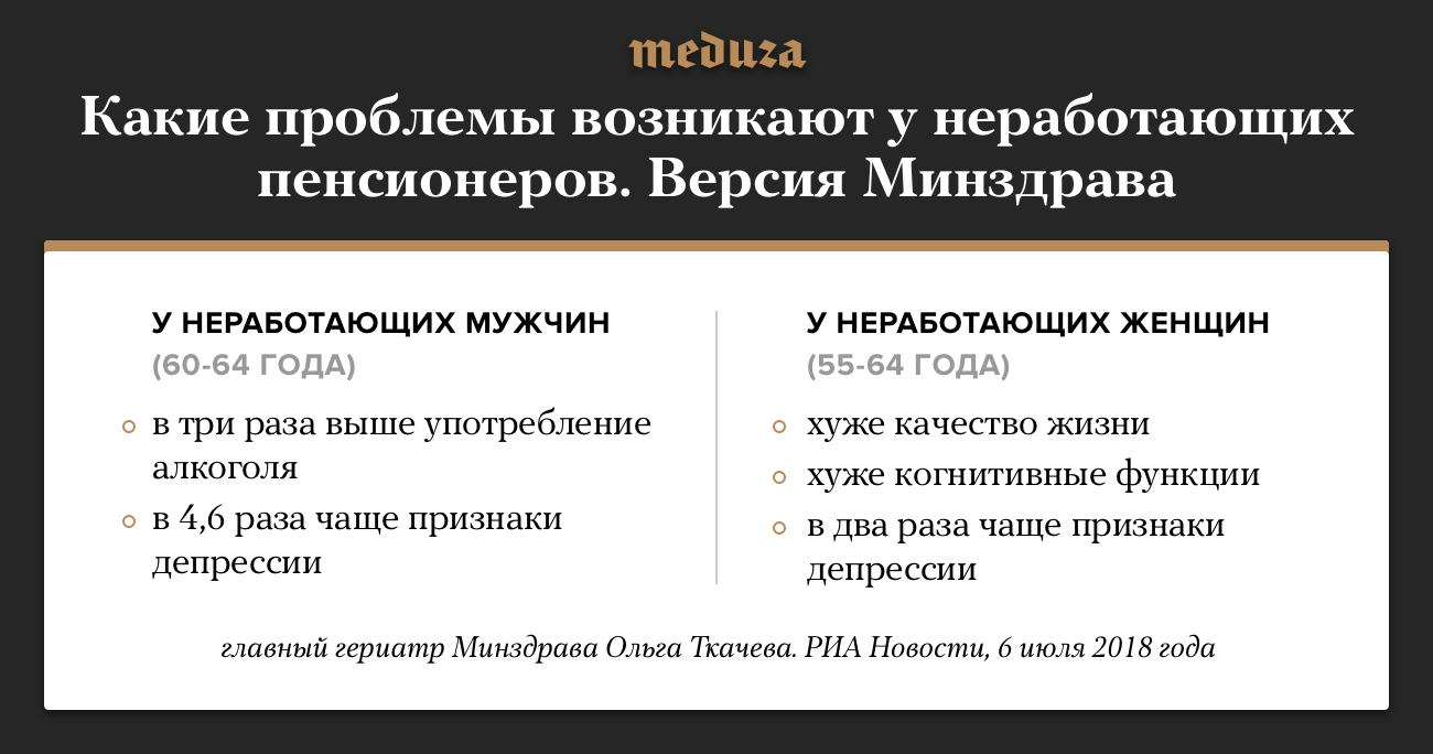 В интервью РИА Новости главный гериатр (врач, помогающий людям старше 60 лет) Минздрава Ольга Ткачева сказала, что повышение пенсионного возраста — «неизбежный процесс», а у работающих пенсионеров, согласно исследованиям, лучше качество жизни и реже обращения к врачам. Большинство россиян выступают против планируемого повышения возраста выхода на пенсию.