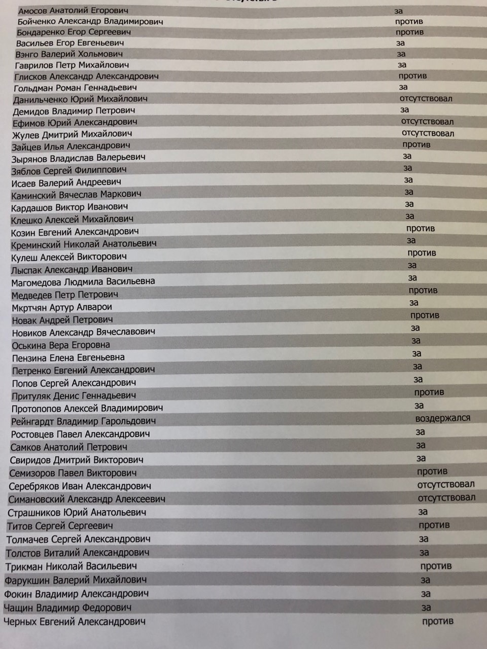 Телеканал также опубликовал поименные результаты голосования. По подсчетам Тайги.инфо, проголосовавшие «За» единороссы заработали в 2017 году в общей сложности более 186 млн рублей, и это еще Данильченко отсутствовал.