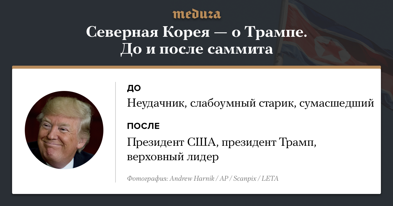 - Риторика представителей США и КНДР по отношению друг к другу в 2018 году неоднократно менялась. В мае президент США Дональд Трамп отменил готовящуюся встречу с Ким Чен Ыном после обмена сторон резкими высказываниями; тем не менее, вскоре переговоры возобновились и первая в истории встреча лидеров США и КНДР состоялась.