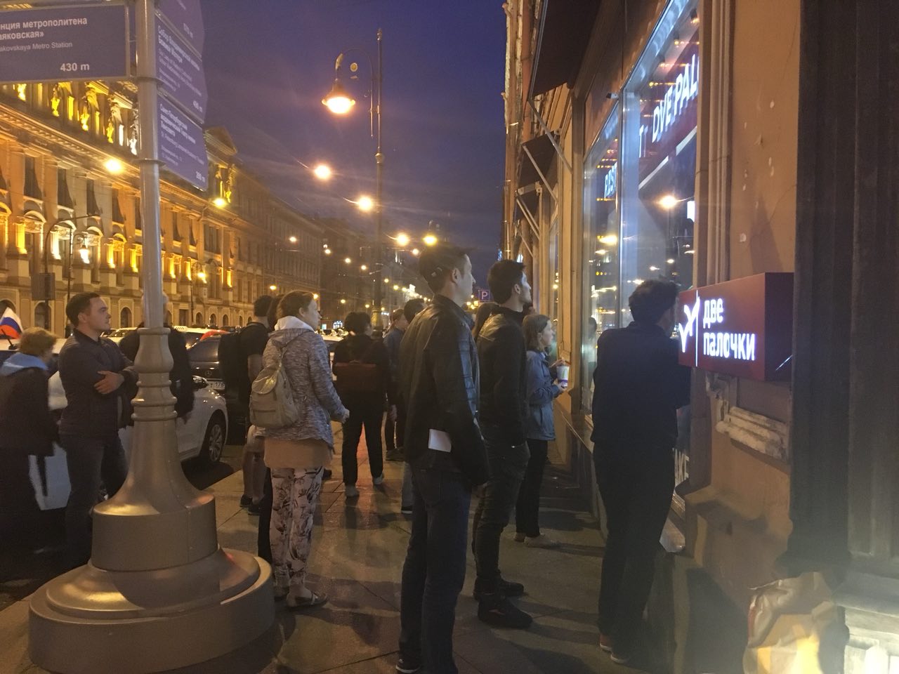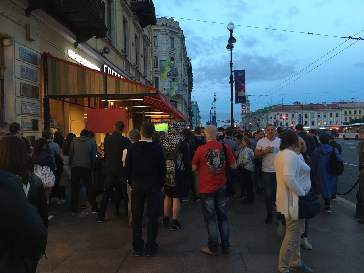 Невский до улицы Рубинштейна — почти безжизненный с редкими прохожими. В «Макдональдсе» людно, в очереди со смартфонов смотрят матч, обрывки трансляции смешиваются с музыкой.