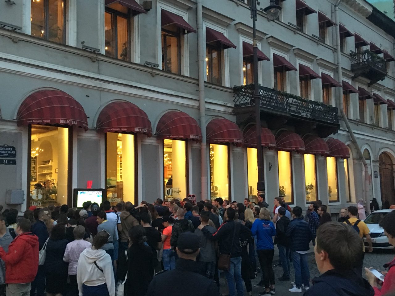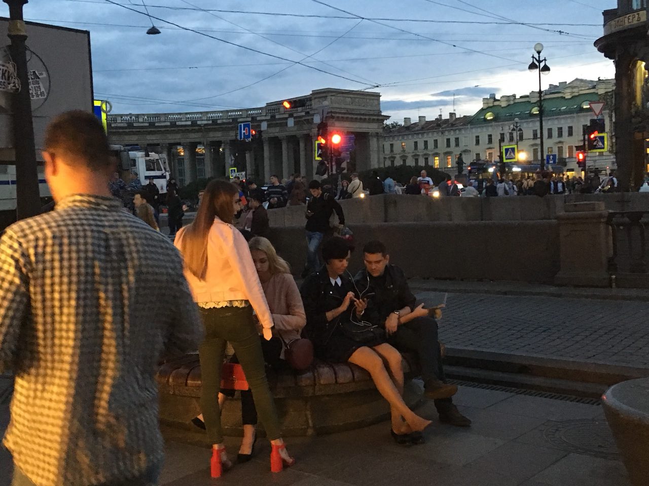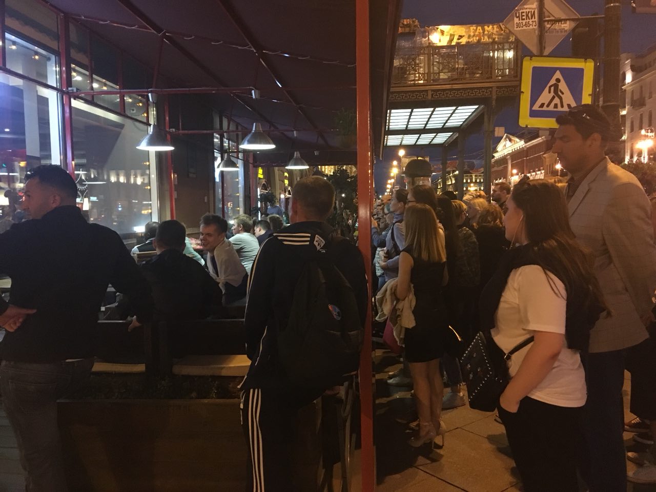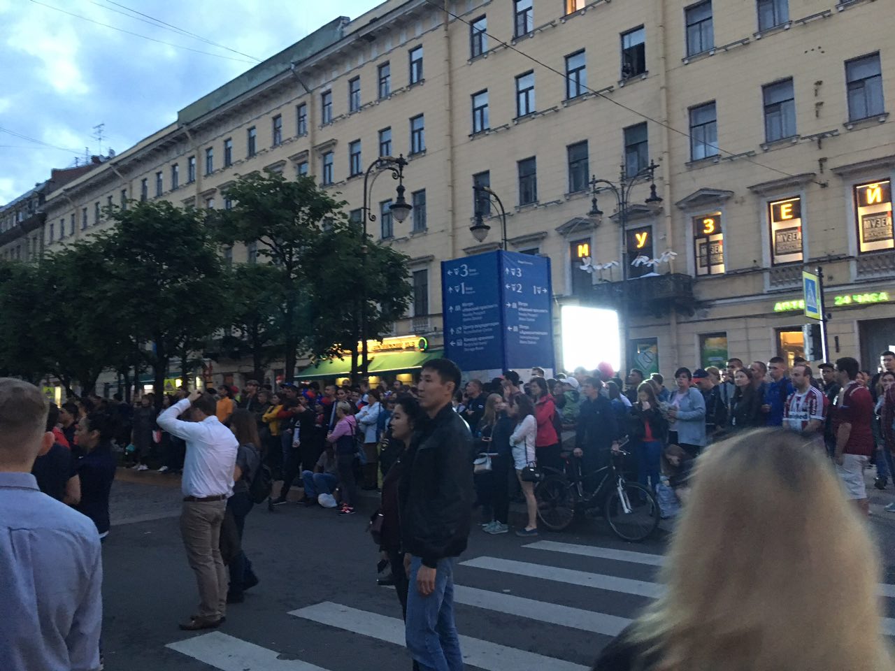 На Невском проспекте через каждые пару метров стоят росгвардейцы, но пока им некого разнимать или утихомиривать: на тротуарах почти нет людей, а те, кто есть, удивлены полиции. «Это там все футбол смотрят?!», — спрашивает девушка на пешеходном переходе у Большой Конюшенной улицы. У ресторана Biblioteka выставлен телевизор, толпятся люди, кричат: «Россия, давай!».