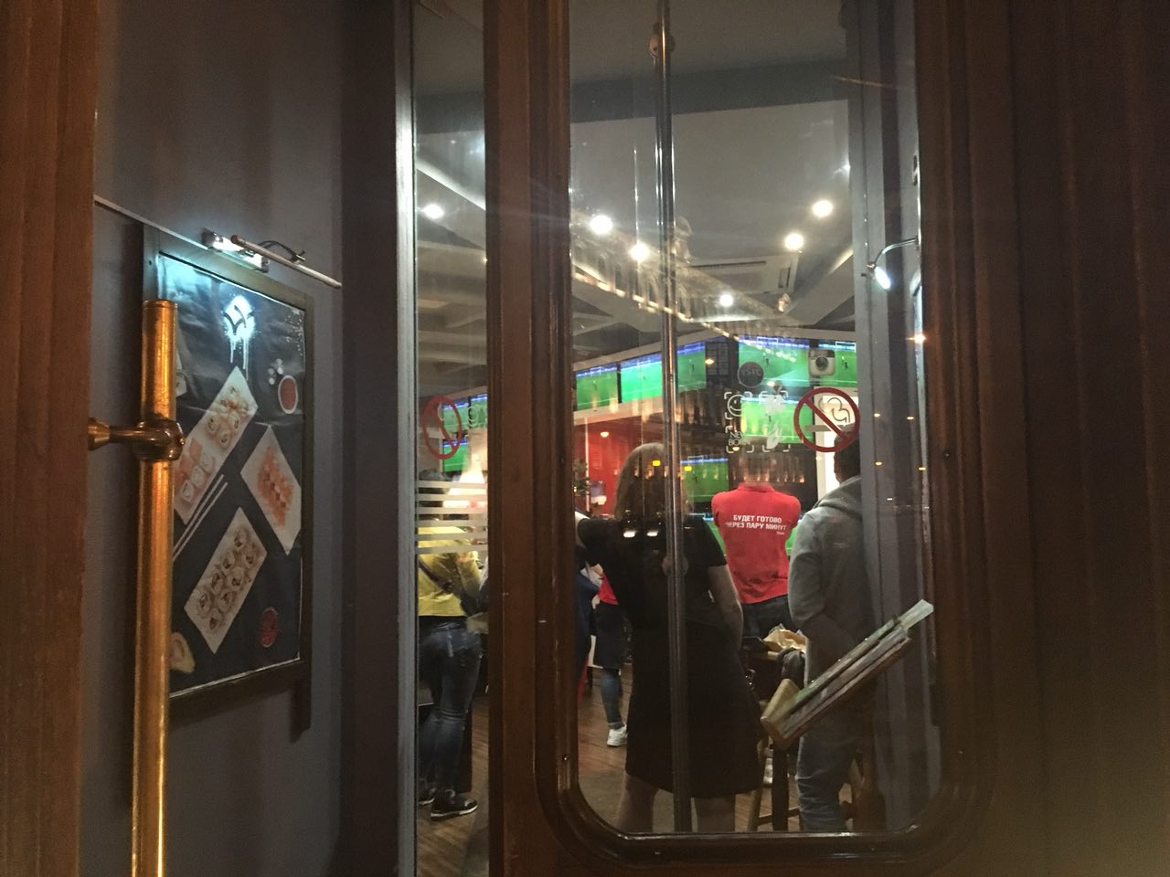 У «Двух палочек» неподалеку от «Маяковской» люди выстроились в линию и смотрят серию пенальти. В самом кафе, кажется, тоже не до посетителей. Официанты стоят у мониторов, чтобы ничего не пропустить. Вход перегородила девушка, которая тоже не может оторвать взгляд от экрана.