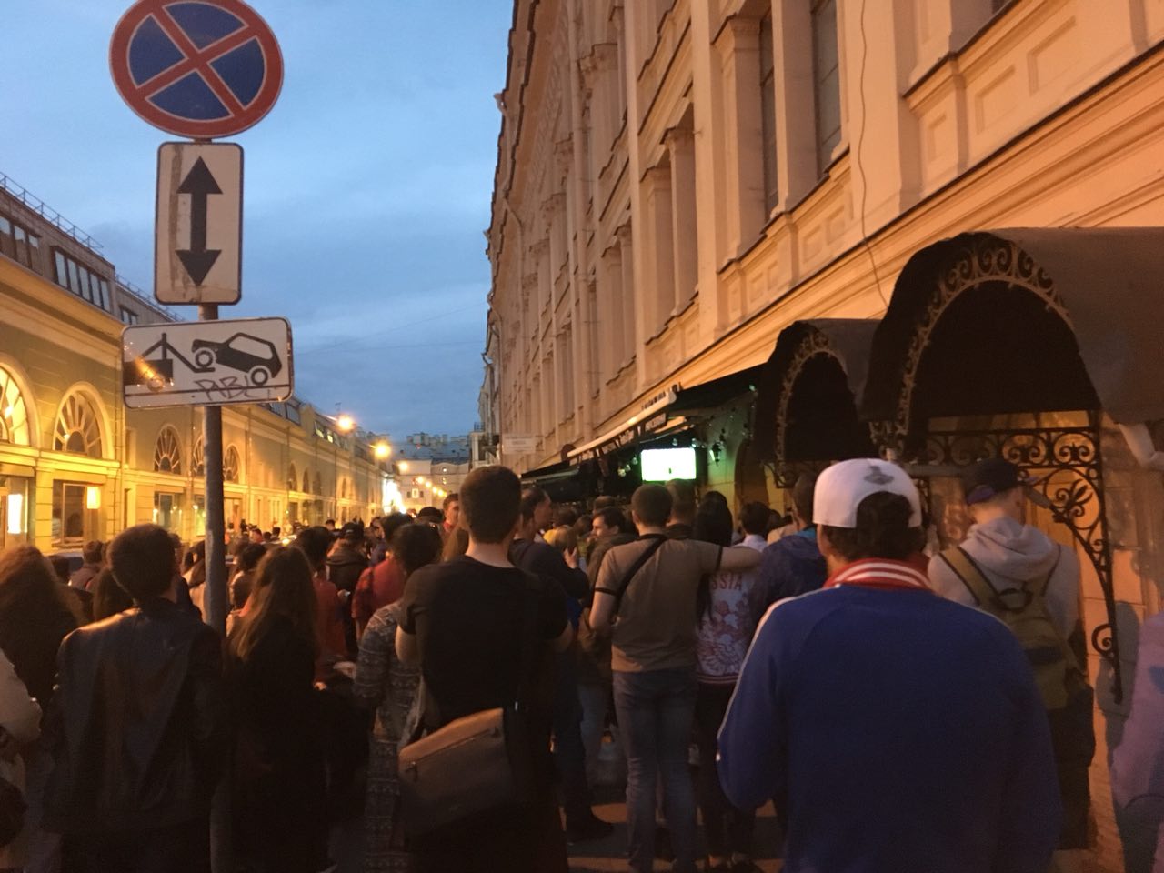 Отрезок Невского у Екатерининского сада казался вакуумом. Вскоре обнаружилась подозрительно тихая толпа, тоже поглощенная матчем. «Россия!» — выкрикнул прохожий болельщикам, но ему никто не ответил, даже шедшие рядом друзья. «Блин, я один тут такой, по ходу», — расстроился он. Но, пройдя двести метров, снова крикнул: «Россия!». И опять никто не откликнулся — все ждали второго гола в ворота хорватов.