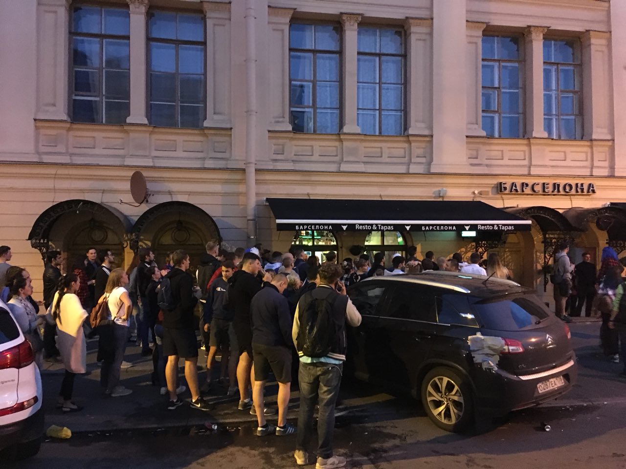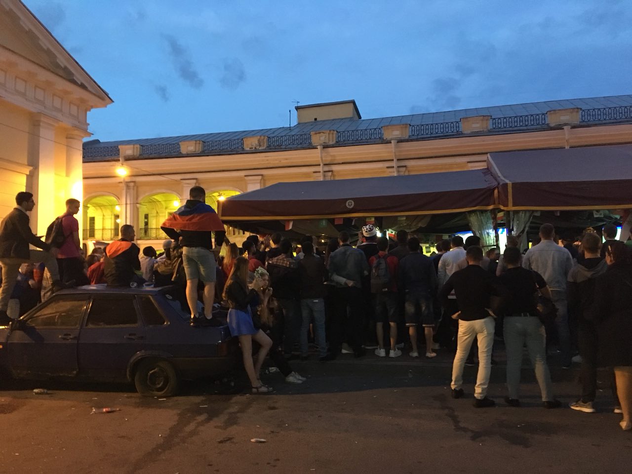Гул в заведениях на Невском переходит в визг, слова «Гол» не слышно, но машины тут же начинают сигналить, прохожие останавливаются и кричат: «Россия, вперед!» беснующимся у баров через дорогу толпам.