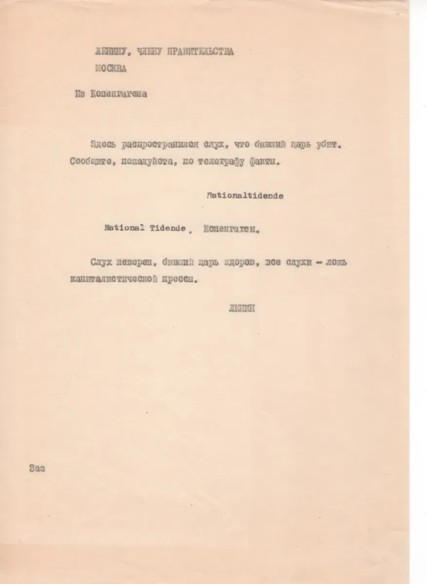 Привожу еще один интересный документ. Это телеграфный запрос от 16 июля 1918 года из Копенгагена, в котором было написано: «Ленину, члену правительства. Из Копенгагена. Здесь распространился слух, что бывший царь убит. Сообщите, пожалуйста, по телефону факты». На телеграмме Ленин собственноручно написал: «Копенгаген. Слух неверен, бывший царь здоров, все слухи — ложь капиталистической прессы. Ленин».