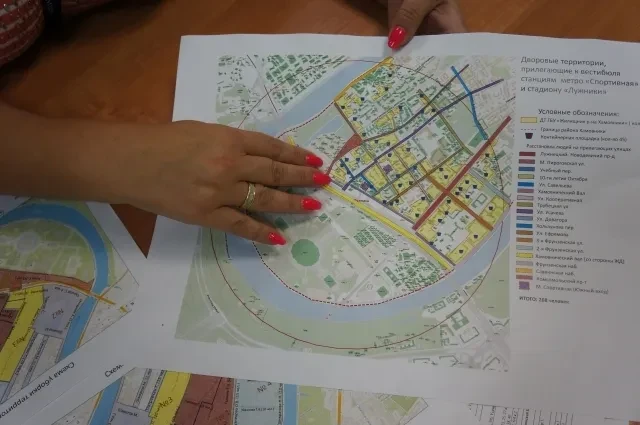 В кабинете уже появился молодой директор ГБУ «Жилищник Хамовники» Юрий Чевычелов, на столе — разноцветные схемы: границы пяти «горячих» подведомственных участков и точки расположения контейнерных площадок, ряды колонок с мобильными телефонами, улицами, дворами и квадратами прикрепления сложнофамильного персонала. — За игру вывозим 5–6 КамАЗов мусора — по мере заполнения. Первой сменой выставляемся на территорию с утра — люди начинают идти с половины двенадцатого.