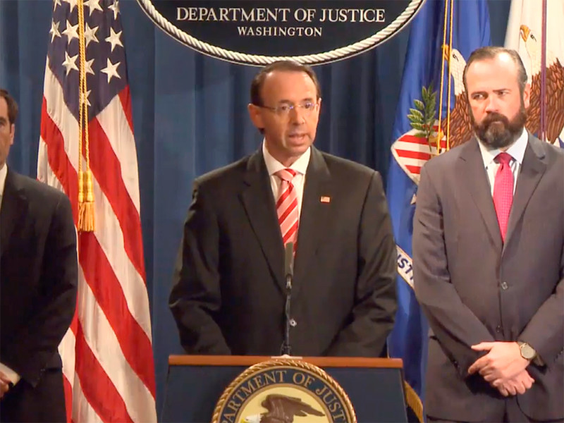 За три дня до встречи в Хельсинки президентов США и России американский Минюст предъявил обвинения 12 сотрудникам российских разведслужб, сообщает в пятницу 13 июля агентство Bloomberg со ссылкой на заместителя генпрокурора США Рода Розенстайна.