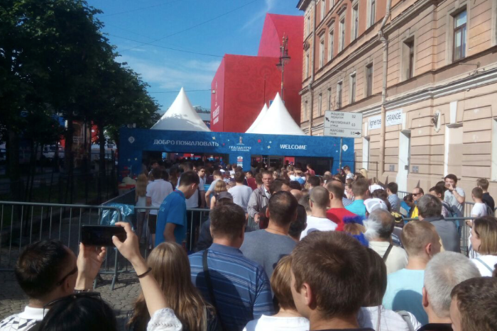 Перед началом матча вход в фан-зону на Конюшенной площади временно ограничивали из-за большого количества желающих, сообщает корреспондент «Бумаги». Это же сообщается в паблике ЧМ во «Вконтакте».
