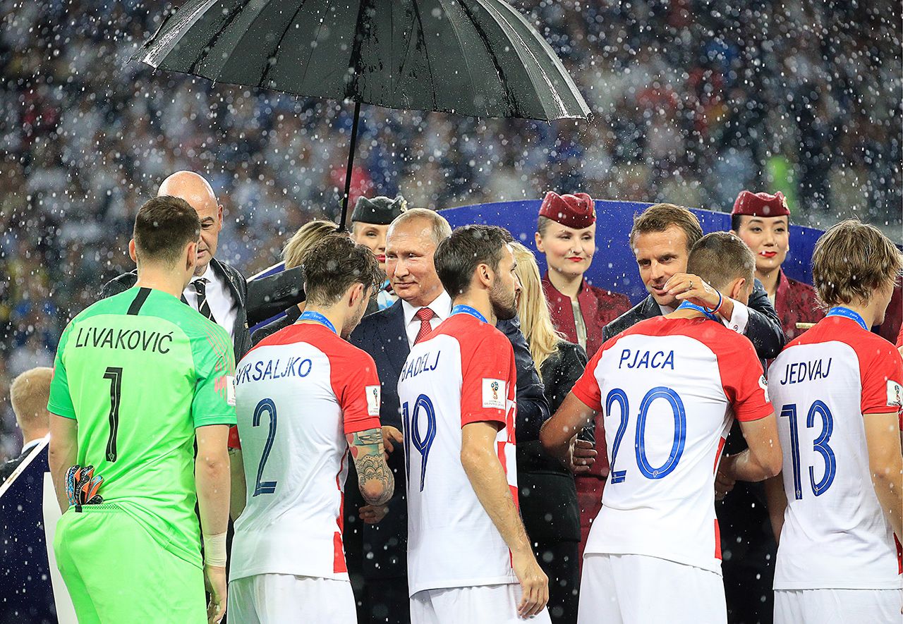 Вечером 15 июля на стадионе «Лужники» в Москве прошел финальный матч чемпионата мира по футболу. Сборная Франции выиграла у сборной Хорватии со счетом 4:2. На трибунах в этот день присутствовали главы десяти стран, в том числе президент России Владимир Путин, президент Франции Эммануэль Макрон и президент Хорватии Колинда Грабар-Китарович. Все трое (а также президент ФИФА Джанни Инфантино) после финального свистка вышли на поле, чтобы наградить футболистов.