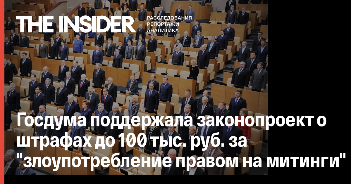 Госдума приняла в первом чтении пакет законопроектов, которые устанавливают штрафы до 100 тысяч рублей в случае злоупотребления правом «на организацию массовых мероприятий, выражающееся в массовой подаче заявок на митинги без цели их проведения».