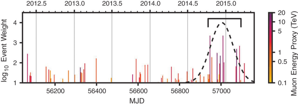 Косвенным подтверждением, что TXS 0506 имеет отношение к делу, стало то, что это нейтрино совпало по времени со вспышкой этого объекта, наблюдавшейся в гамма-квантах высокой энергии. Но более сильное свидетельство дали архивные раскопки. Авторы открытия проверили все нейтрино, которые приходили с данного направления (кружок размером градус вокруг TXS 0506). В основном там оказались нейтрино умеренных энергий до 10 ТэВ, среди которых преобладают атмосферные. Но в конце 2014-го — начале 2015 года с исследованного пятачка пришла целая пачка нейтрино энергии выше средней. Вероятность случайного появления такой пачки — примерно 1/3000 (3,5 о). Вместе с нейтрино 2017 года это становится уже достаточно сильным свидетельством, чтобы заявлять об открытии нейтринного излучения от данного объекта.
