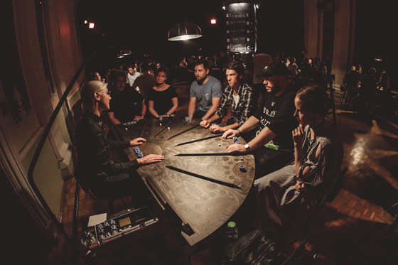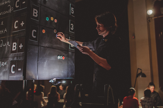Сцена из проекта «Ложь» Глобальную экономику представляет импровизированный зал казино. Столов десять, за каждым — семь игроков и актер-крупье. Каждый зритель — это банк, каждый стол — вымышленное государство, названное в честь первого прибывшего игрока (например, Георгиевы Острова или Святая Анна). Ваш начальный капитал зависит от того, сколько у вас с собой наличных: сто рублей — это одна фишка, или миллион игровой валюты (не волнуйтесь, вы не потеряете ни копейки настоящих денег).