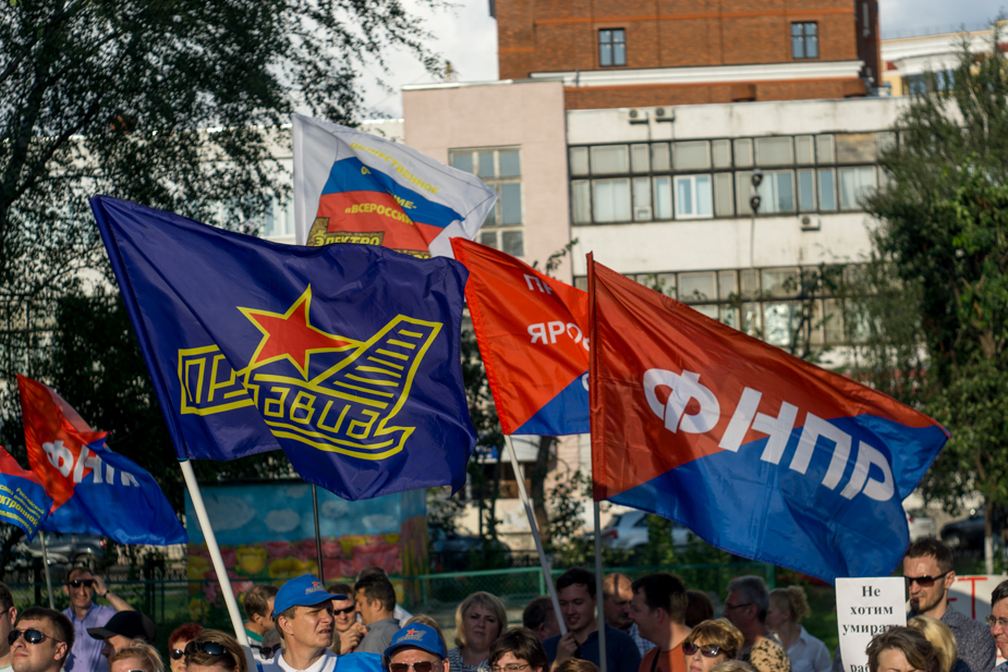 В 18:00 организаторы митинга развернули в парке сцену, с которой выступили пять профсоюзных лидеров. Один из них потребовал у пришедших на акцию активистов Либертарианской партии России (ЛПР) убрать их флаги, «чтобы избежать проблем с правоохранительными органами». Кроме них и членов профсоюзов на митинг пришли активисты «Левого фронта» и КПРФ. Коммунисты раздавали пришедшим приглашения на свой митинг 26 июля. Глава ярославского обкома КПРФ Александр Воробьёв рассказал «7x7», что они соберут в несколько раз больше участников. После всех выступлений митингующие организованно сложили транспаранты и флаги в одно место, и за пять минут основная масса разошлась.