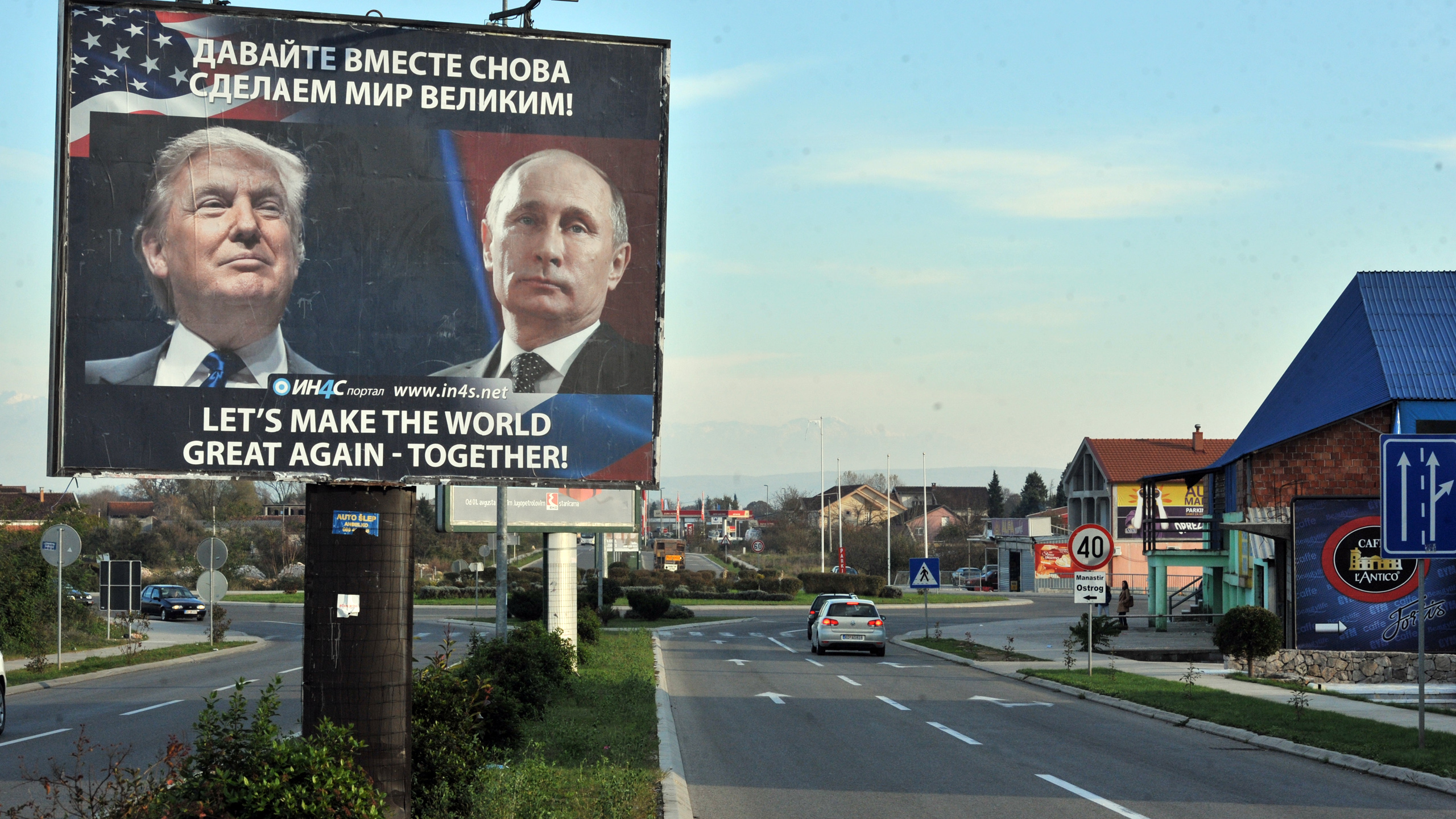 Плакат с изображением Дональда Трампа и Владимира Путина, установленный в Черногории после избрания Трампа президентом США