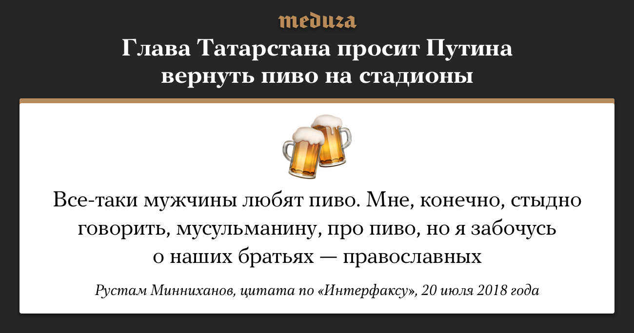 Глава Татарстана Рустам Минниханов во время обсуждения итогов ЧМ-2018 попросил президента Владимира Путина подумать над возвратом пива на стадионы. Минниханов заявил, что во время чемпионата, когда продажа была временно разрешена, только в Казани было продано пива на 89 миллионов рублей и «никаких эксцессов, проблем не было». Путин пообещал рассмотреть предложение Минниханова.