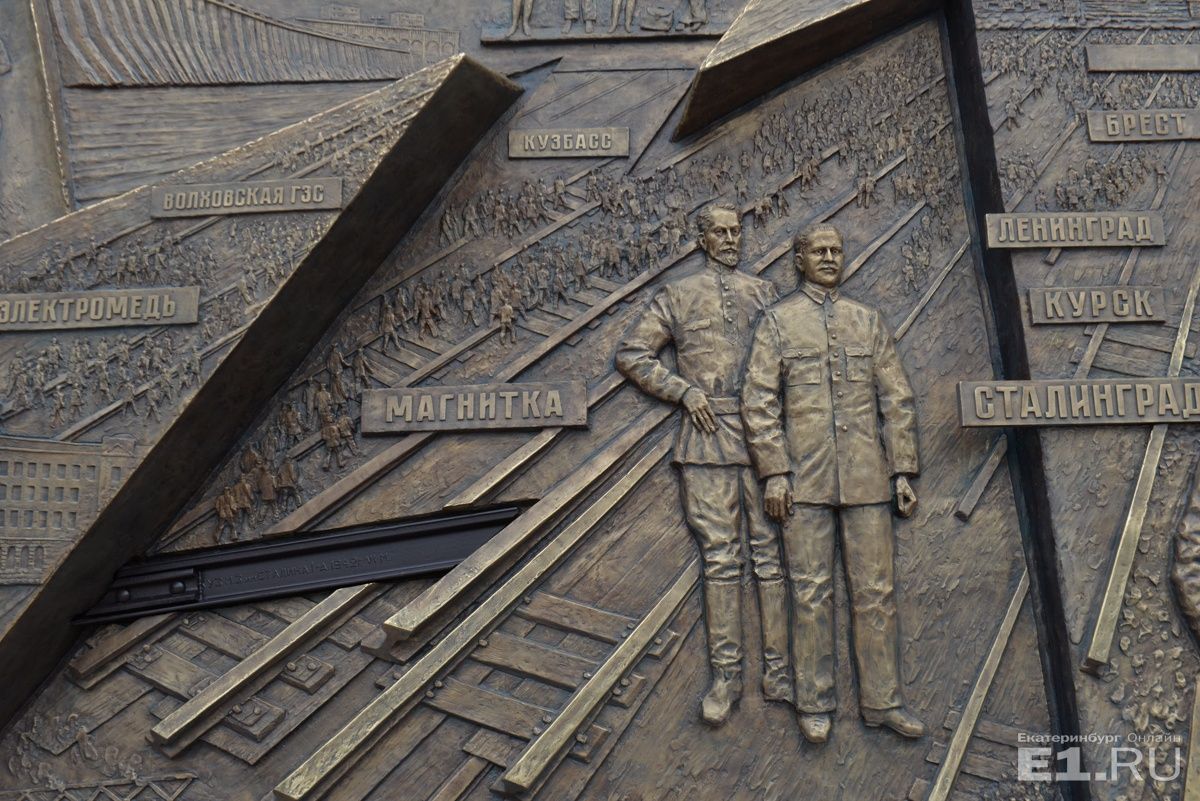 Обновление: Автор монумента Сергей Титлинов сообщил Znak.com, что на барельефе изображен не Сталин, а Лазарь Каганович. Дзержинский и Каганович, напомнил он, были наркомами путей сообщения, «внесшими значительный вклад в развитие железных дорог».