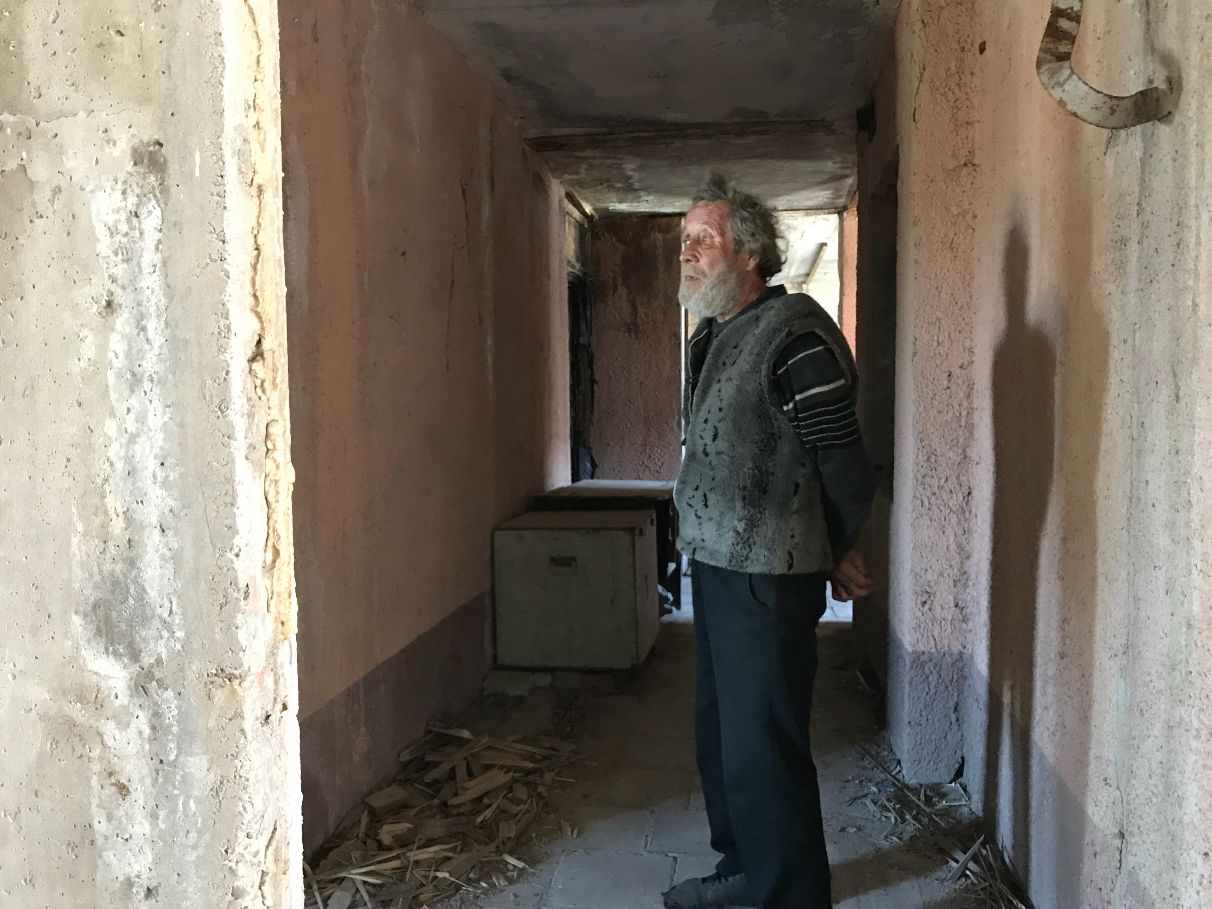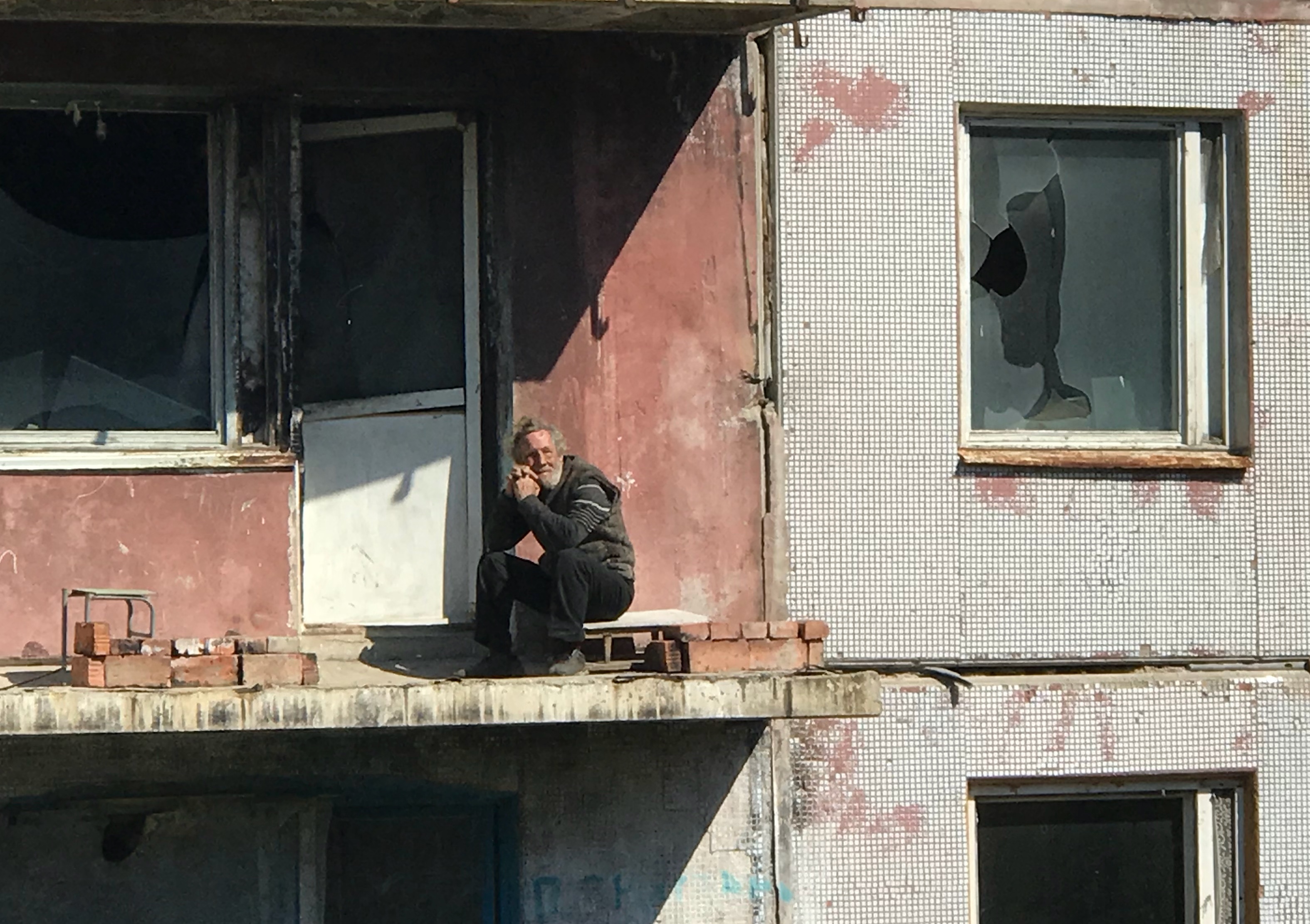 Среди руин, оставшихся от военного гарнизона, стоит заброшенный дом с выбитыми окнами. На третьем этаже, на балконе без перил, сидит мужчина. Здесь он – единственный житель.