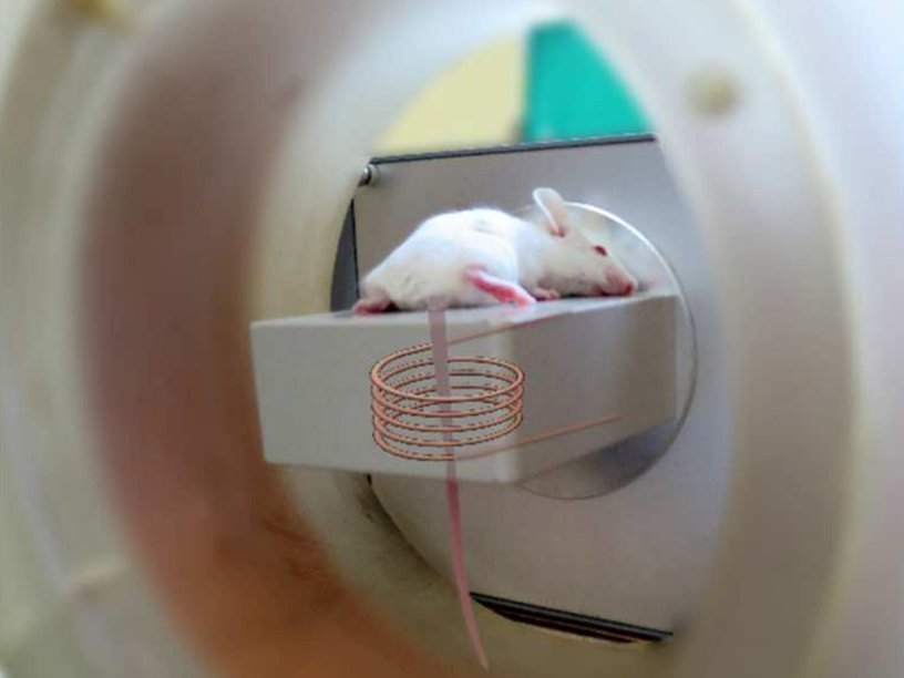 Рисунок 2. Иллюстрация проведения эксперимента: вся мышь (под анестезией) помещалась во внешнюю катушку, генерирующую постоянное магнитное поле при включении, в то время как хвост мыши помещался в измерительную катушку MPQ-прибора.