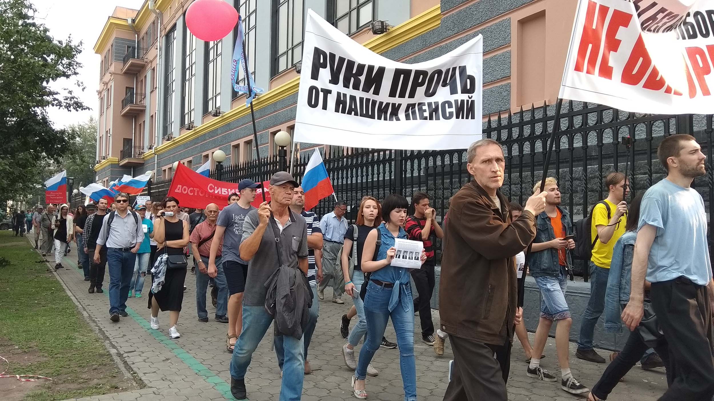 Многие лозунги были посвящены закону о пенсионной реформе, который Государственная дума приняла в первом чтении: "Повысить пенсионный возраст только тем, кто голосовал за Путина!", "Руки прочь от наших пенсий!", "Путин украл у нас нашу нефть, наши выборы, нашу свободу, а теперь еще и наши пенсии…". Во время демонстрации иркутяне вспомнили имена депутатов Госдумы от Иркутской области, которые проголосовали за повышение пенсионного возраста: Алексея Красноштанова, Сергея Тена, Николая Николаева и Андрея Чернышева. Люди кричали: "Чернышев – позор России", "Красноштанов, вон из думы! ", "Николаев позорит Иркутск!".