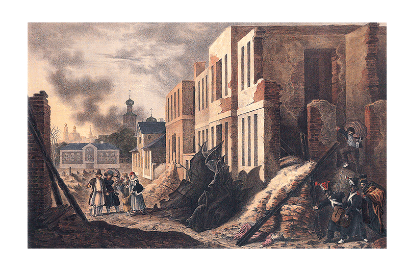Пожар Москвы 1812 года, с одной стороны, подчистил аутентичный вид города, с другой — позволил продвинутым эстетам вроде Пьера Безухова насладиться видом погорелых остатков, а с третьей — включить события Отечественной войны в систему общекультурных кодов: от библейских, с разрушением Иерусалимского храма, до античных — ну да, да, с разрушением Геркуланума и Помпей.