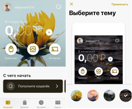 Пользователь «Яндекс.Денег» может добавить на главный экран до трёх самых нужных ему функций, которые потом можно поменять в профиле. Среди них — транспорт, ЖКУ, интернет, QR-оплата и мобильные платежи. Также можно выбрать оформление главного экрана из 16 тем.