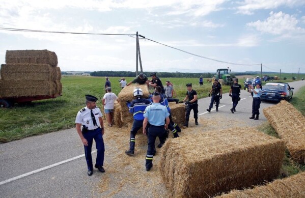 Во Франции протестующие фермеры перегородили дорогу тюками сена и прервали велогонку «Тур де Франс»