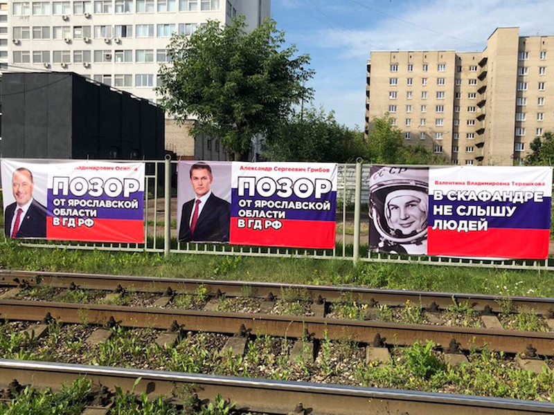 Чести красоваться на "заборе позора" удостоились три депутата нижней палаты парламента от Ярославской области - Александр Грибов, Илья Осипов и Валентина Терешкова. Фотографии с видом на баннеры можно увидеть, в частности, в публикациях в соцсети "ВКонтакте".
