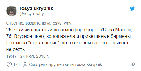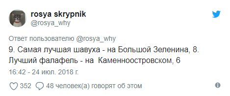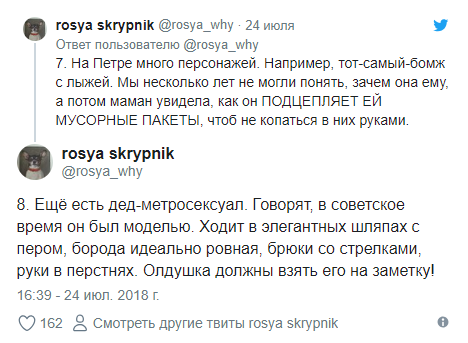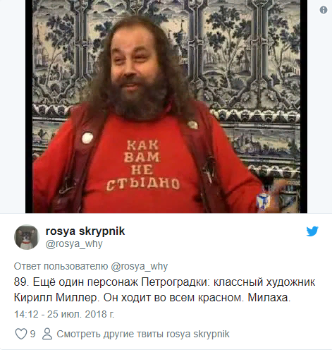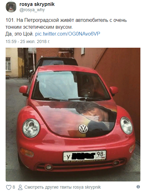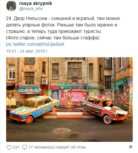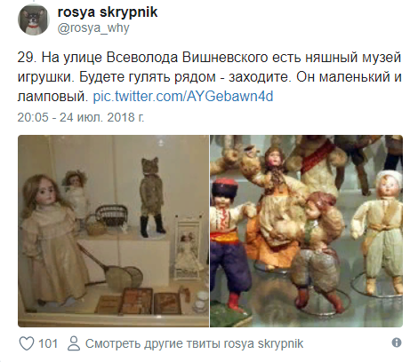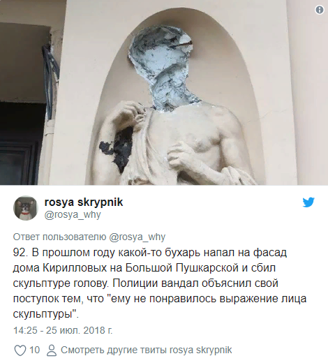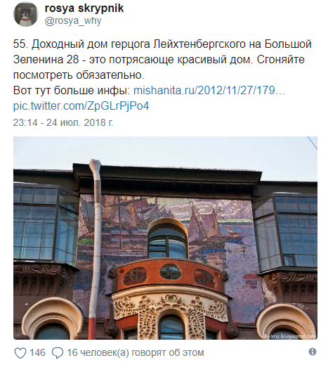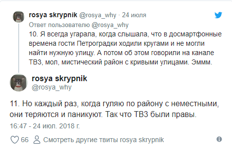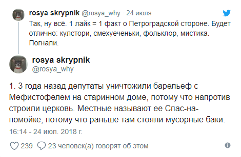 Пользовательница твиттера под ником rosya skrypnik 24 июля пообещала постить по одному факту о Петроградской стороне за каждый лайк. К моменту публикации новости запись набрала более 1800 лайков.