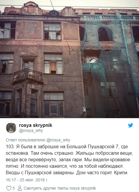 Некоторые твиты рассказывают о мифах и мистических историях, связанных с Петроградским районом.