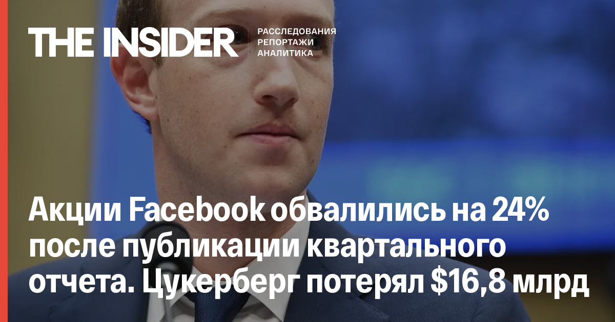 Акции социальной сети Facebook упали на 24% сразу после закрытия основных торгов в США. По подсчетам Bloomberg, основатель компании Марк Цукерберг лишился около $16,8 млрд.