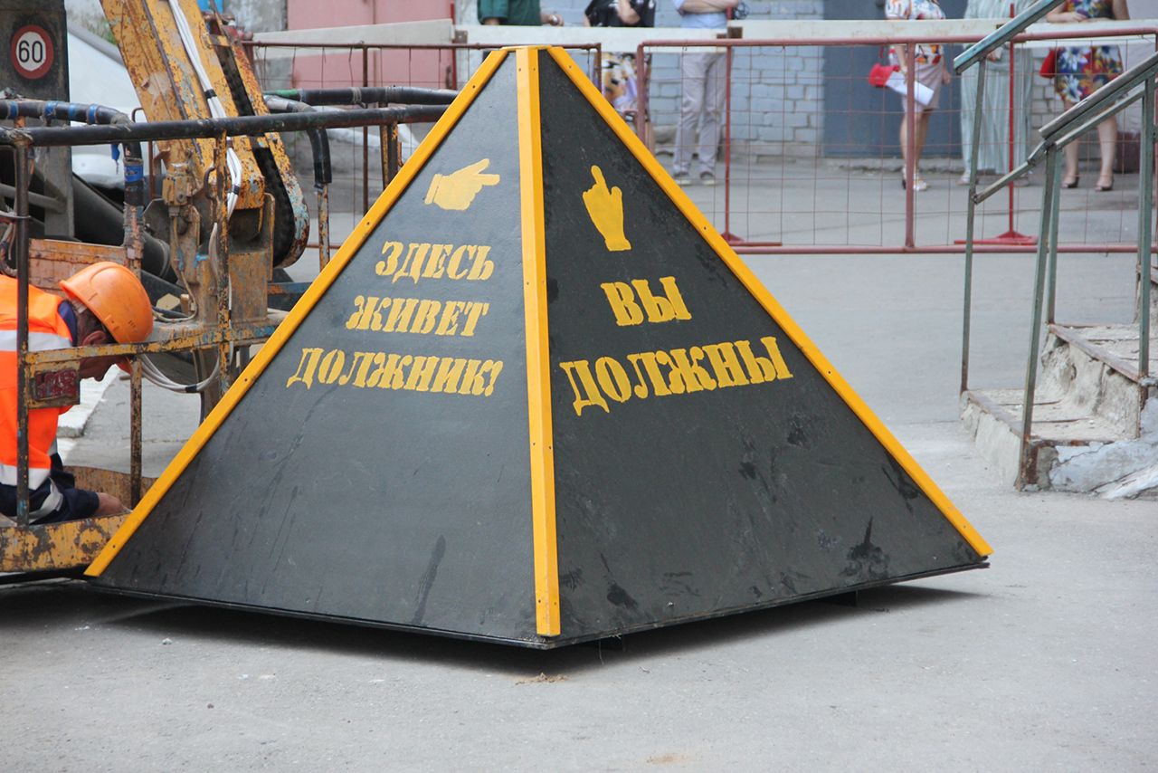 Обновлено: в первой версии заметки сообщалось, что поднятая на второй этаж пирамида весит три тонны. На самом деле это облегченная версия классической «пирамиды позора». «Медуза» приносит извинения читателям, коммунальщикам и должникам.