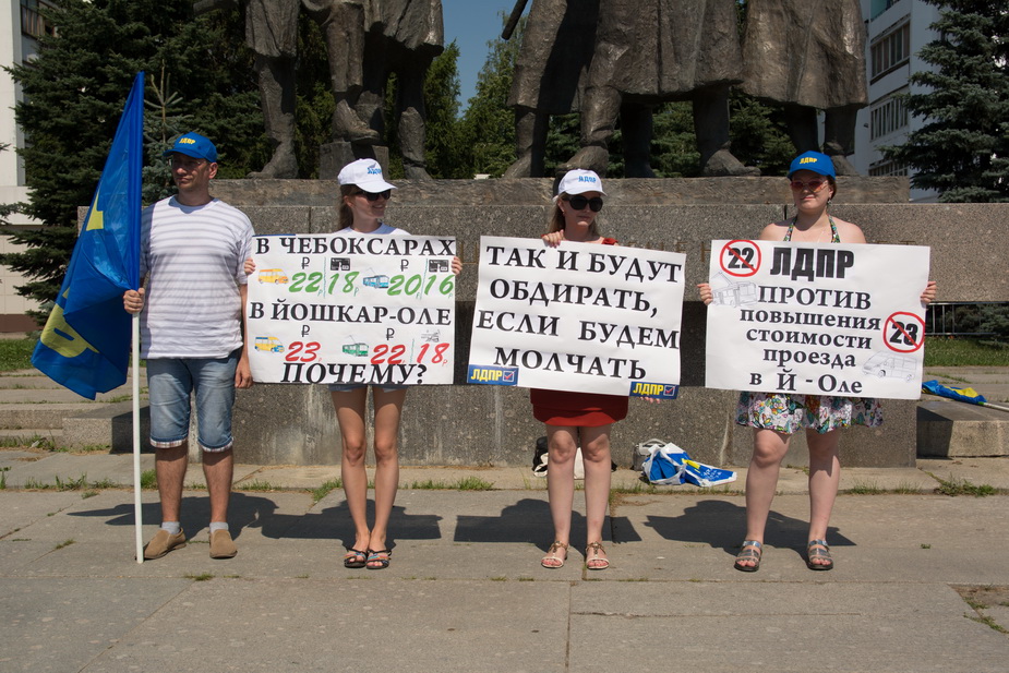 Члены марийского регионального отделения ЛДПР 27 июля вышли с пикетом на Комсомольскую площадь (напротив Дома Быта), протестуя против высоких цен на проезд, сообщил корреспондент «7x7».