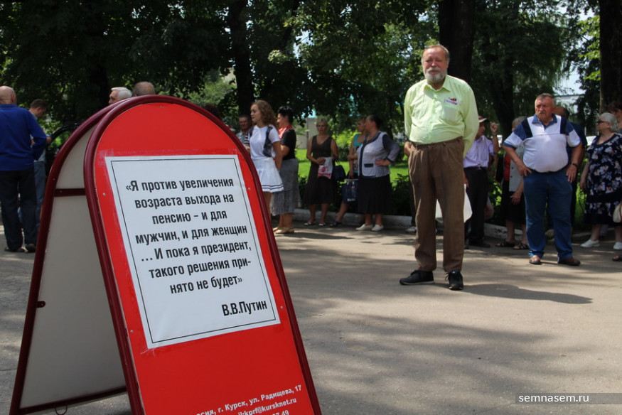 В руках митингующие держали плакаты: «Помоги государству! Сдохни до пенсии!», «Это не реформа, а грабеж!», «Хотим дожить до пенсии», «Не хотим работать до смерти», «Повышение пенсионного возраста – очередная разновидность геноцида Советского народа». На самодельном плакате «Вот эти думают о нас? Позор!!!» одна из участниц акции протеста разместила фотографии курских депутатов Госдумы от «Единой России».