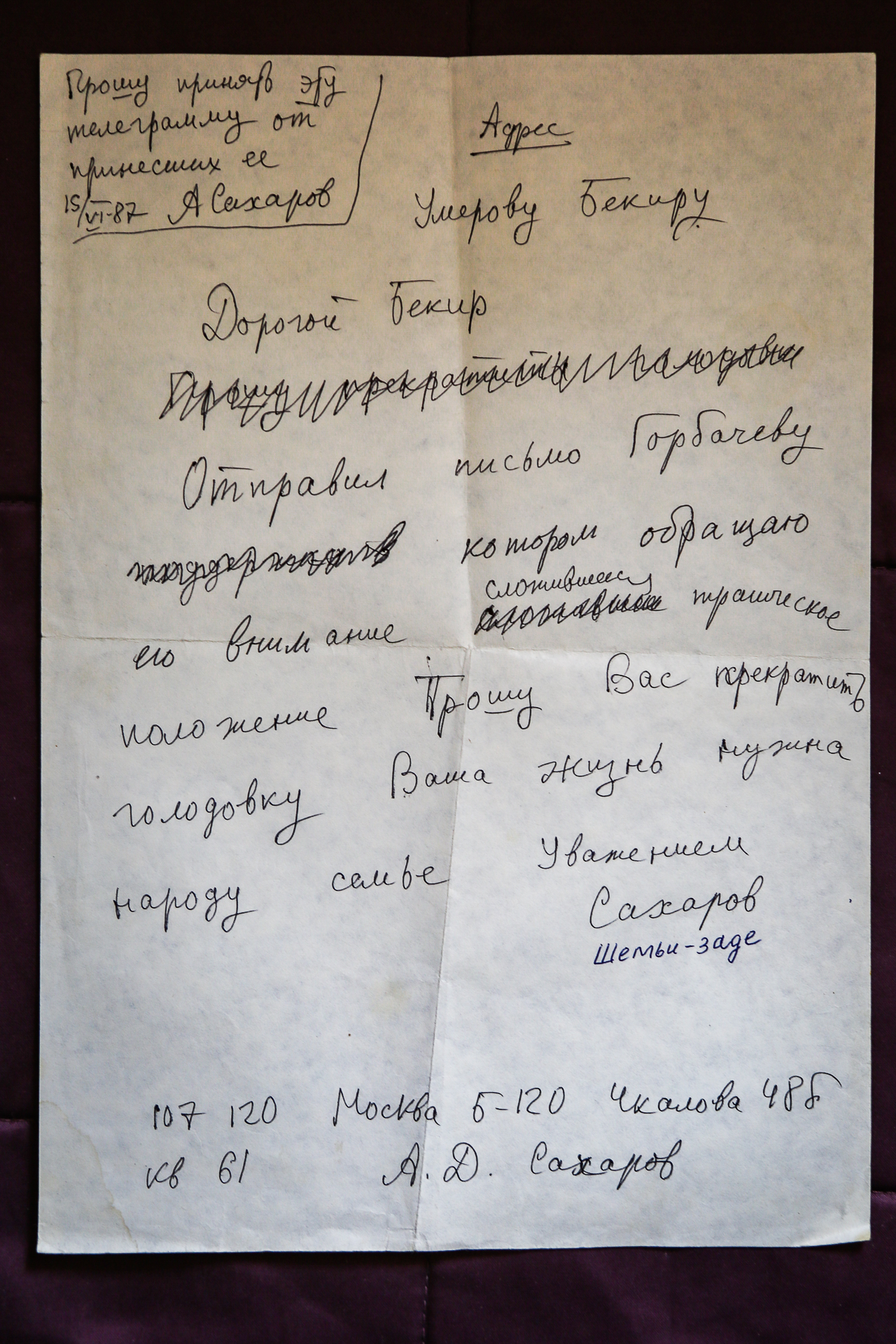 Так продолжалось более четырех недель. Наши активисты отправили в Москву группу людей для того, чтобы максимально распространить информацию о моей голодовке. Им удалось встретиться с Андреем Сахаровым и рассказать ему, что в Краснодарском крае голодает крымский татарин Бекир Умеров, требуя встречи с руководством СССР. Андрей Дмитриевич написал мне тогда письмо с просьбой прекратить голодовку. Честно говоря, я был очень благодарен ему, но не прислушался.