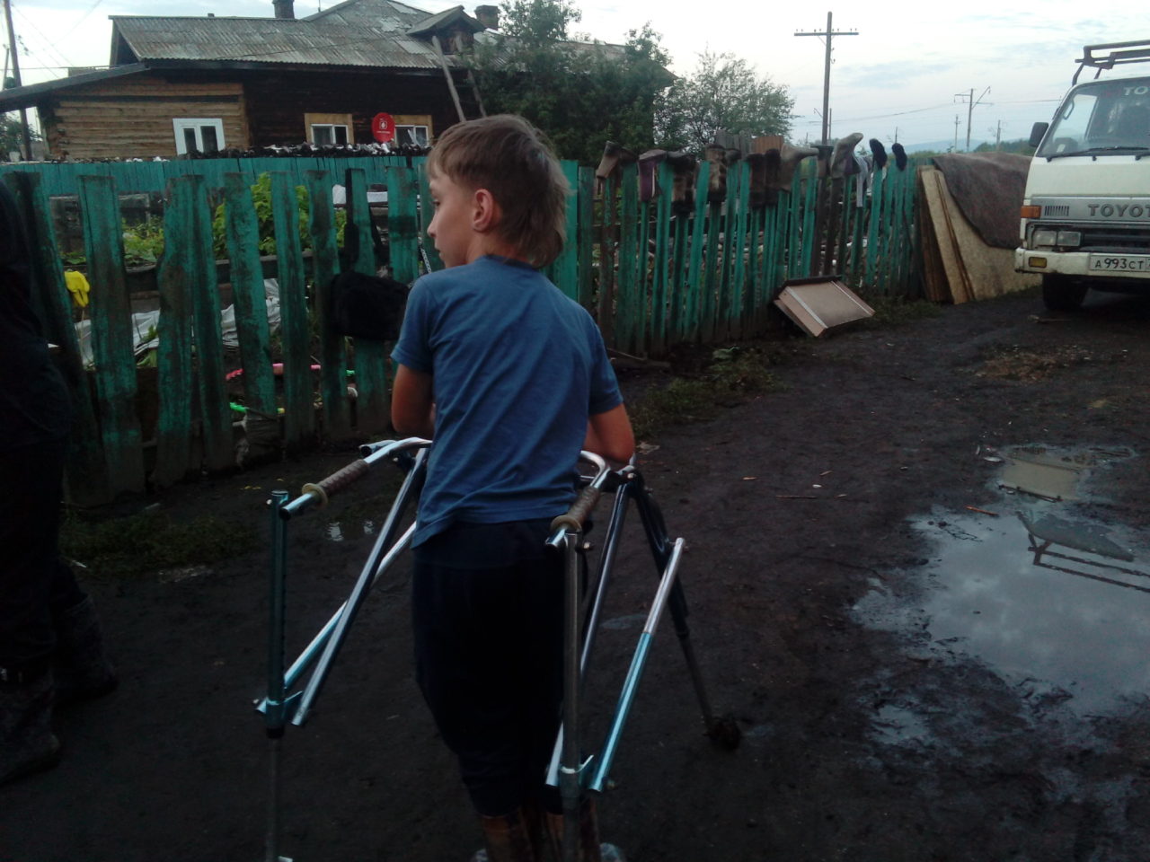 Иван Калягин рядом с домомФото: Андрей Беспалов Евгений с соседскими мужиками купил в складчину машину дров — надо хоть как-то просушивать дома. Парень с сильно искривленными ногами ловко забирается в кузов и скидывает поленья на сухой островок перед домом. Это Олег Туранов, ему 23 года, у него тоже ДЦП. Олег — парень с сильным характером. Пока мать работает, он на хозяйстве. Из десятка домов, пострадавших от наводнения, в которые мы заходили, дом Олега — самый чистый, тщательно прибранный. Пустой, только холодильник лежит на старом обеденном столе — это все, что парню удалось спасти.
