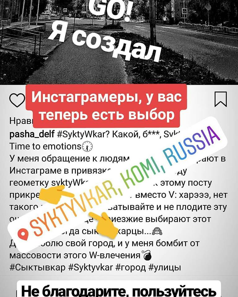 На днях по работе пришлось мониторить публикации сыктывкарцев в Instagram... У меня опять дико подгорело от сотен людей, живущих в каком-то фейковом городе SyktyWkar, судя по геометке (SyktyWkar, Komi, Russia), которую они упорно выбирают и цепляют к своему разномастному контенту.