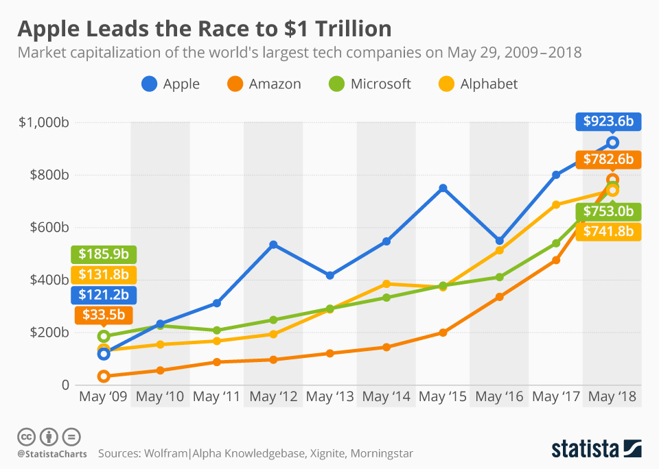 - Apple осталось совсем немного, чтобы все-таки стать первой компанией в истории, добравшейся до капитализации в $1 трлн. Тем более, что она очень старается – в первом квартале компания выкупила рекордное число своих акций.
