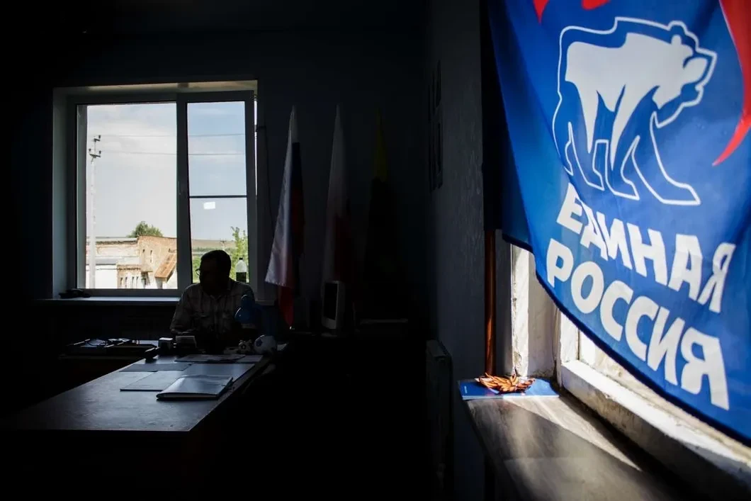 Дверь в кабинет главы сельсовета Вячеслава Мохова открыта. Синий флаг «Единой России» загораживает трещину в оконном стекле. На стене — портреты президента, губернатора и районного главы. Герб Вольска — спящий медведь. Дамы в соседнем кабинете хором объявляют, что начальник уехал: «В Вольск, то есть нет, в Шиханы!» И спорят, указывая друг на друга, кто из них должен замещать шефа в его отсутствие.