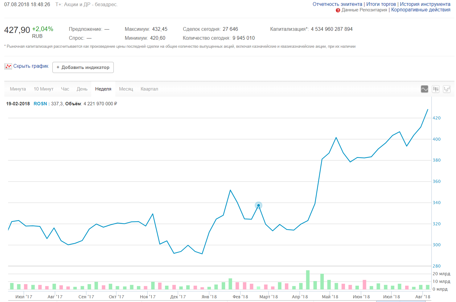 - Триумф «Роснефти» объясняется так: вчера компания подтвердила планы до 2020 года провести buy-back на сумму до $2 млрд, а сегодня – отчиталась о рекордной квартальной прибыли, которая выросла по сравнению с прошлым кварталом сразу на 20% и составила 373 млрд рублей. Это больше, чем ждали аналитики и инвесторы. Компании помогли рост цен на нефть, укрепление рубля (72 млрд рублей в прибыли – это курсовые разницы) и единовременный доход от покупки долей в совместных компаниях с ExxonMobil (еще 23 млрд рублей).
