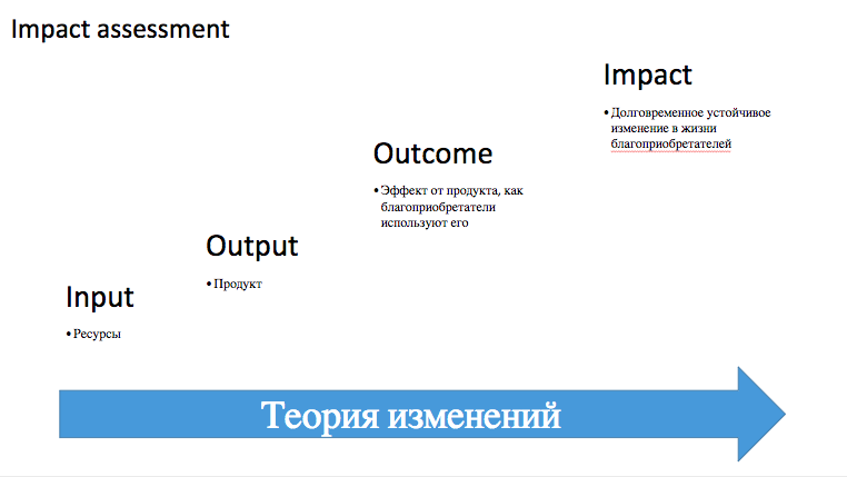 - Impact – долговременное устойчивое изменение в жизни целевой аудитории.