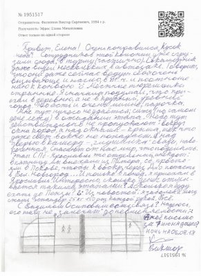 Привет, Елена! Очень понравился «Кусок неба» [рассказ Нины Катерли, который Эфрос отправляла Филинкову]. Сотрудников этой колонии уже сгрузили сюда, в турму (частично). Сокамерник даже видел нескольких в автозаке. Говорит, что они даже сейчас ведут себя очень вызывающе и нагло, в том числе и по отношению к конвою. Местные тюремщики странные. Я сначала подумал, что приехал в деревню, а не в крупный, древний город. Но есть и очень милые, парочка.
