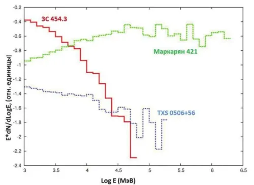 Спектры BL Lac’ов гораздо жестче: энергия, излучаемая гамма-квантами не убывает в сотнях ГэВ и даже в ТэВах (это видят черенковские телескопы). Дальше гамма-кванты поглощаются по дороге из-за взаимодействия с инфракрасным фоном, которым галактики заполнили Вселенную. Поэтому мы не можем сказать, как далеко тянется спектр гамма-квантов BL Lac’ов. Зато недавно было зарегистрировано нейтрино с энергией выше 200 ТэВ от «рядового» блазара TXS 0506 +056 — тоже BL Lac (см. trv-science.ru/2018/07/17/pervyj-krik-nejtrinnoj-astronomii/). Его спектр, усредненный по 10 годам, показан на рис. 5. Он мягче, чем спектр близкого Mrk 421, что естественно — первый находится в трехстах с лишним миллионов световых лет, второй — в четырех миллиардах, поэтому жесткая часть его спектра сильно поглощена.