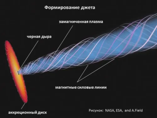 Магнитное поле со своей энергией не может исчезнуть в космосе, как в медной обмотке, перейдя в тепло. При этом веществу, прежде чем упасть в черную дыру или на формирующуюся звезду, надо как-то избавиться от магнитного поля, иначе оно своей упругостью будет сопротивляться гравитации. Есть два основных способа сделать это. Первый — пересоединение петель магнитного поля. Именно это происходит с турбулентным магнитным полем Солнца, в результате чего мы любуемся таким результатом солнечных вспышек, как полярное сияние. Второй путь избавиться от магнитного поля — выбросить его подальше вместе с вмороженной плазмой.